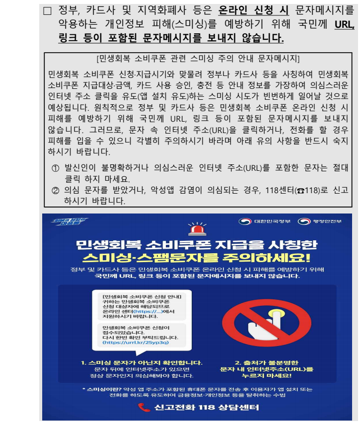 정부는 어떤 경우에도 문자 메시지로 링크를 보내지 않으며, 카드사나 지역상품권 업체도 마찬가지입니다. 최근 스미싱 피해가 증가하고 있으므로, 링크가 포함된 문자를 받았다면 절대 클릭하지 말고 118로 신고하시기 바랍니다. 안전한 신청을 위해 공식 채널만 이용하시기 바랍니다.