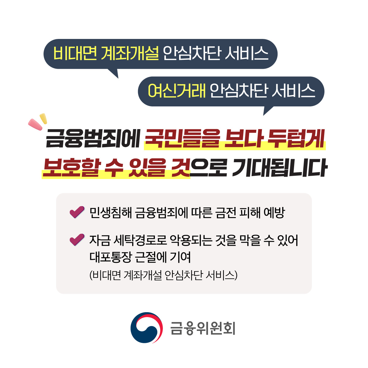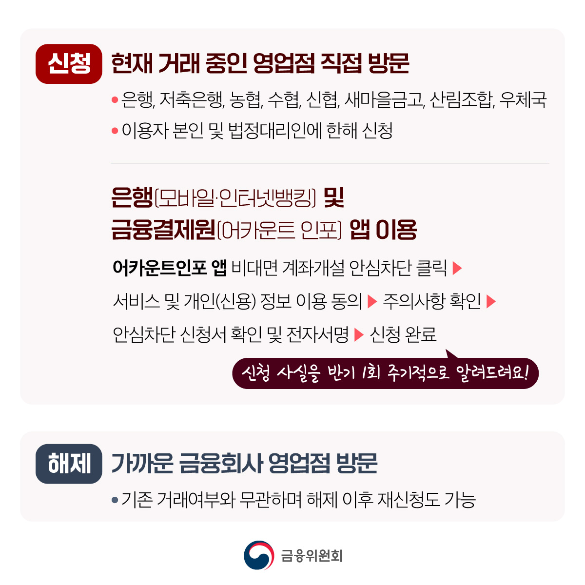 기존에는 금융감독원의 파인(FINE) 홈페이지에서만 신청이 가능했지만, 2025년 3월부터는 금융결제원(어카운트 인포 앱) 또는 전국 모든 은행 창구에서 신분증만 있으면 간편하게 신청과 해지가 가능해졌습니다. 복잡한 온라인 인증 없이, 가까운 은행만 방문하면 누구나 쉽게 설정할 수 있는 점이 큰 장점입니다.