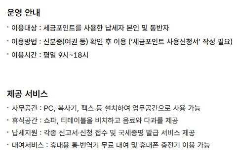 - [모범납세자 전용 비즈니스센터]는 성실납세로 국가재정에 기여한 '모범납세자'에게 제공되는 혜택이나, 세금포인트 사용시 모든 납세자가 이용 가능